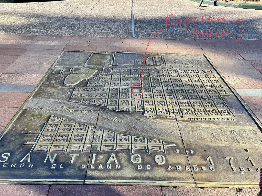 It is Furperson’s understanding that this verdigris-coloured chap was the first Marxist elected to high office in Latin America. He was killed in the coup d’état led by Augusto Pinochet on September 11, 1973. There are rumours the CIA may have shown some support for this possibly poor choice of replacement. Funnily enough, there are no statues of Augusto anywhere that Furperson could find. Please note the press conference, presumably about my visit, going on in the background.