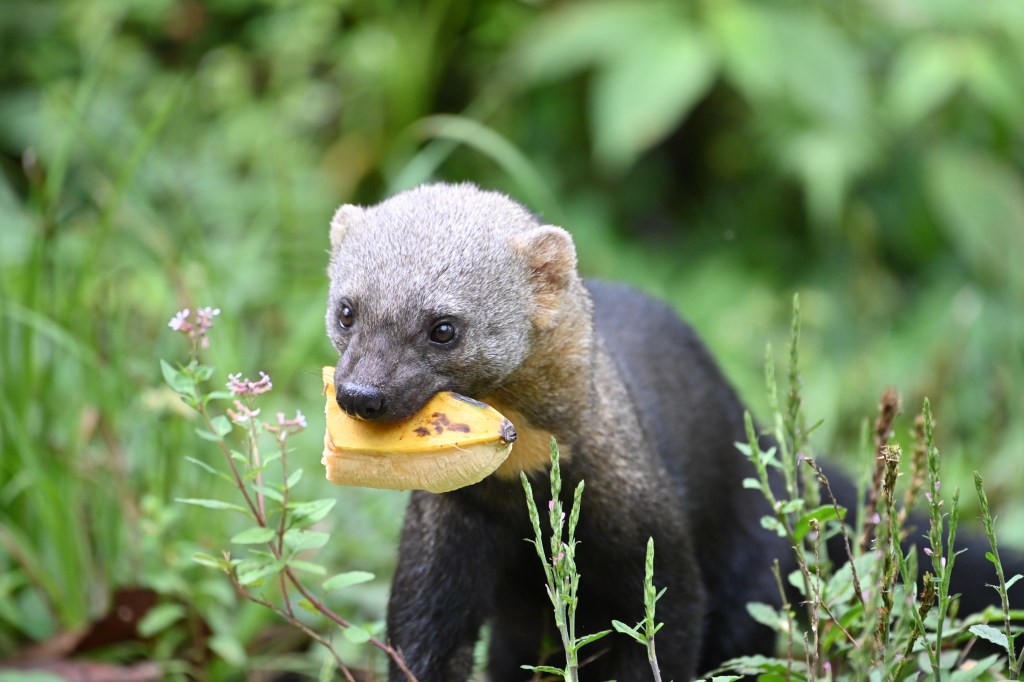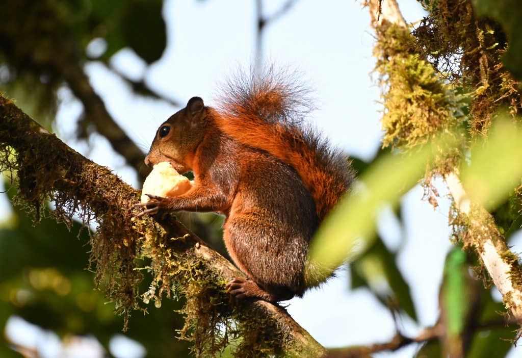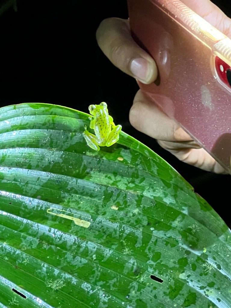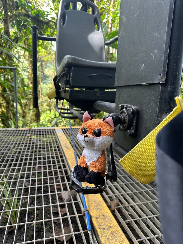The taira, a most magnificent member of theMustelidae family. Other famous mustalids include weasels, badgers and wolverines. I myself am at least 10 percent wolverine. The emerald glass frog. My humans spent an hour blundering around in a river, in the dark, looking for this little fellow, with something like a thousand spiders scuttling over every surface to keep them company. Needless to say, they didn’t find the frog themselves, and had to rely on less incompetent humans. The red squirrel, an expat from North America. These chaps have retained their instinct for burying food for the winter, which of course never arrives up here. So, squirrels are the most excellent dispersers of seeds in the forest. The mighty praying mantis. A larger cousin of this chap catches hummingbirds in its forelegs, and eats their heads… and only their heads. So, there are little headless hummingbird corpses in the jungle. Not disturbing at all.On the observation tower at the start of the Skybike cable system, which my female human refused to countenance. I found the pedalling somewhat challenging. The gondola ride, AKA the Dragonfly. Suspended over a series of gorges. Amazing/terrifying, depending on your attitude towards heights. My very brave female human single-handedly held our gondola aloft via sheer willpower and a white-knuckled grip throughout the entire 60 minute journey.We trekked along this river in gumboots. One of us managed to completely fill her gumboots with water. Another one of us managed to drop his iPhone in the water, despite being told not to. My male human, in his customary pose. Because there’s always room for another photo of a choco toucan. A banana, seen here with a flame-faced tanager.