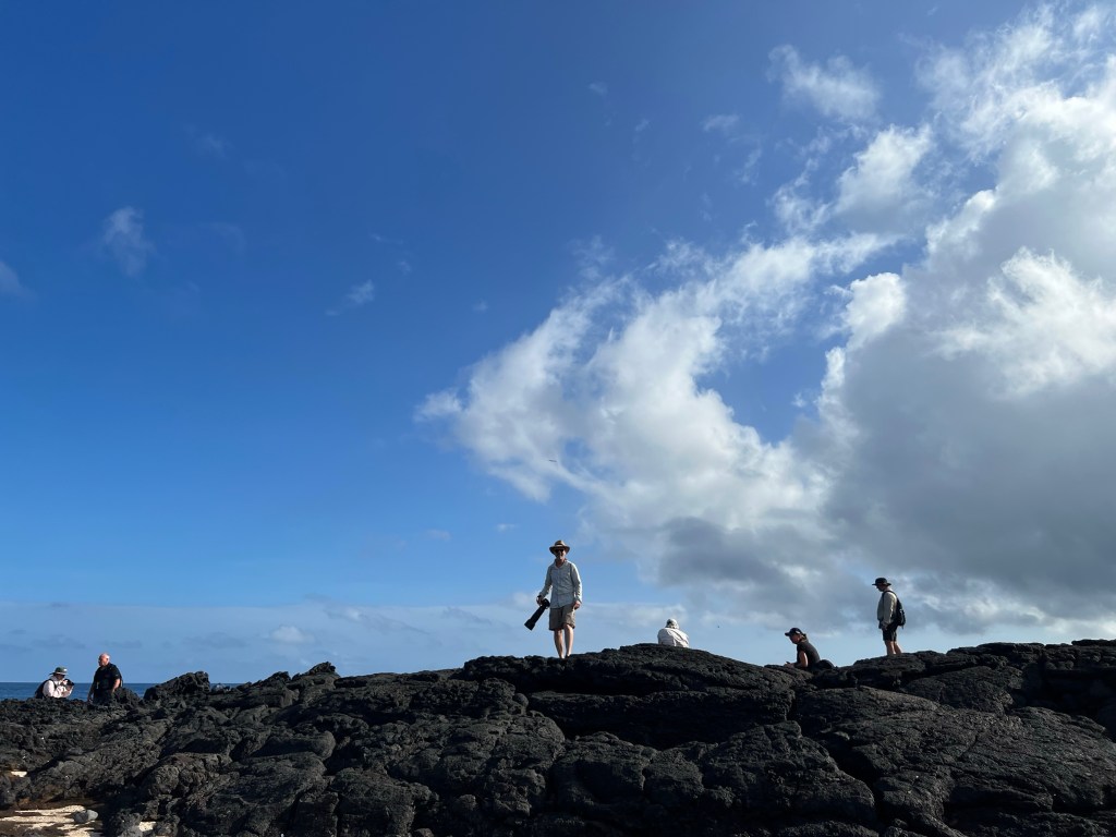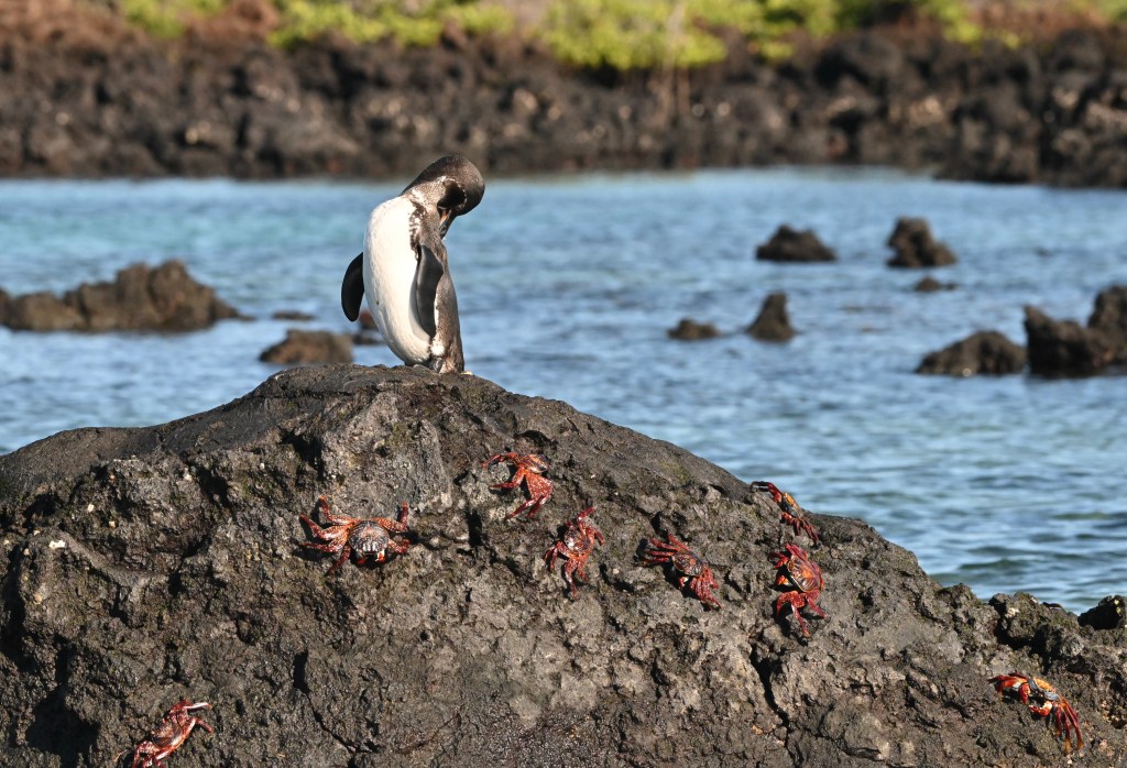 A Galapagos penguin, blissfully unaware of the approaching Sally Lightfoot boarding party